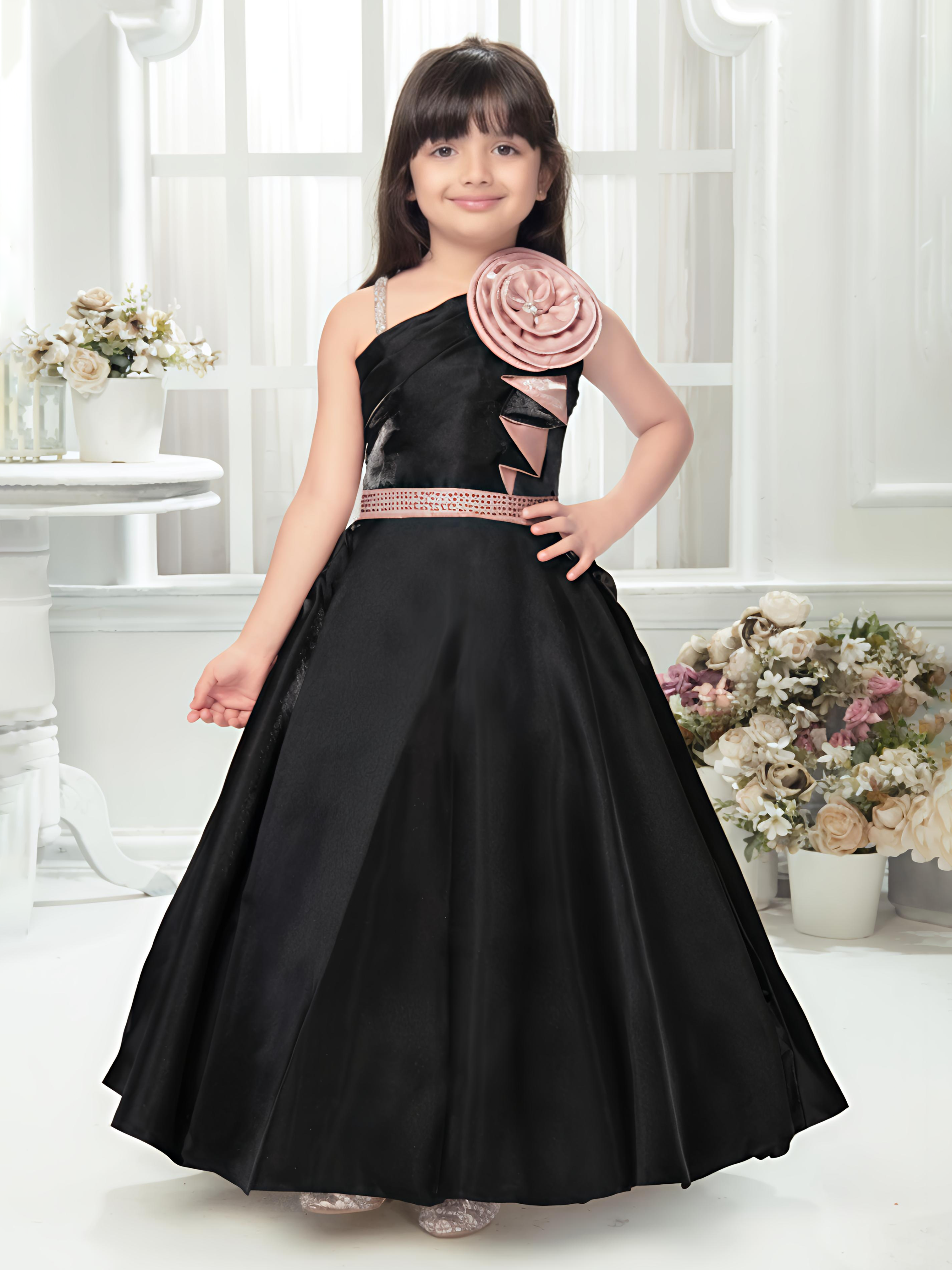 Black One-Shoulder Gown with Rose Appliqué for Girls