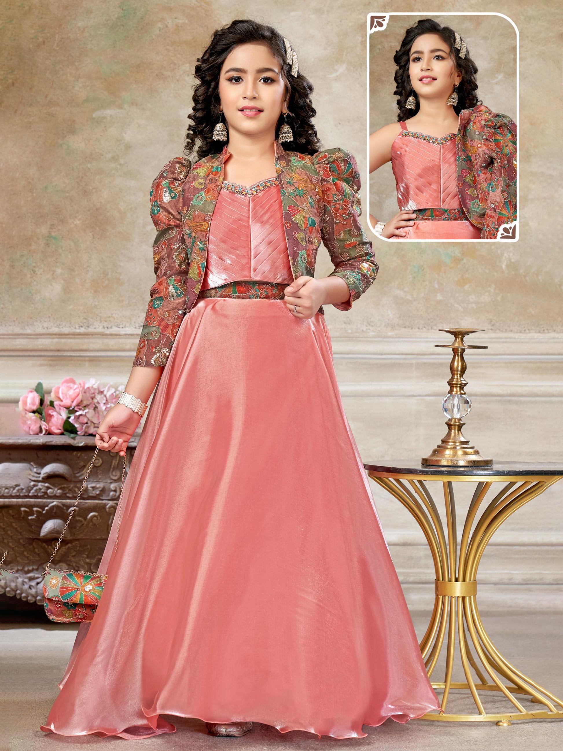 Peach Choli with Inner & Printed Jacket – Girls Ethnic Party Wear Set