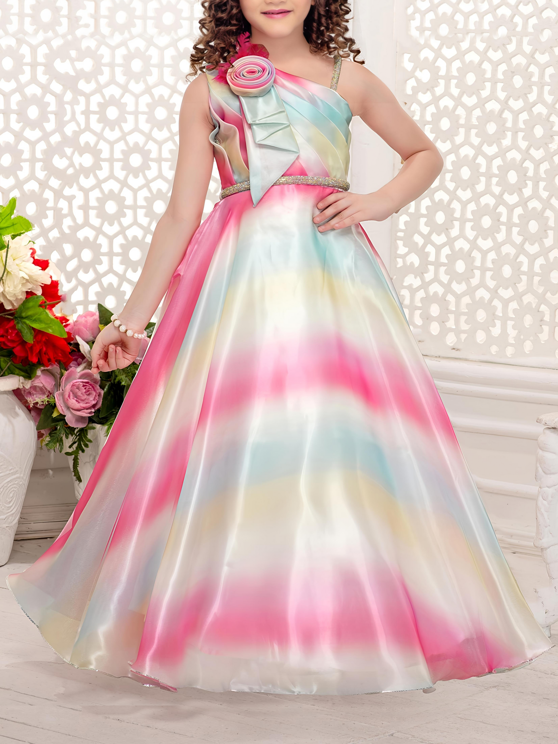 Rainbow Pastel One-Shoulder Gown for Girls – Party Wear Dress